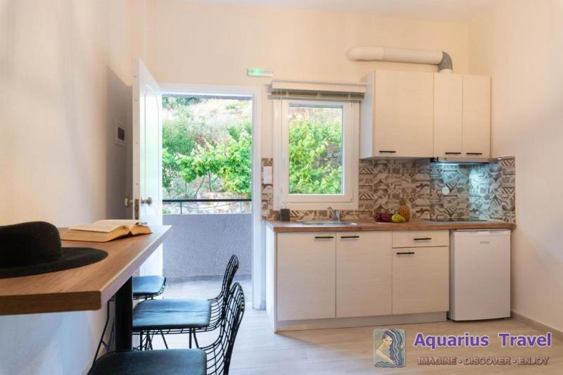 • Κουζίνα με ψυγείο και ηλεκτρικές εστίες μαγειρέματος.